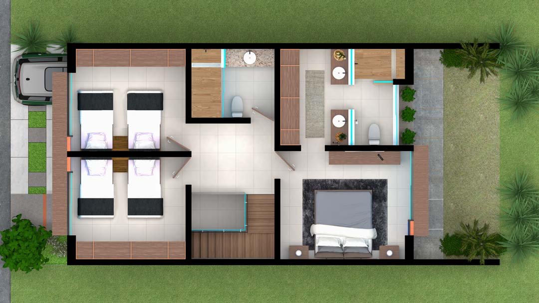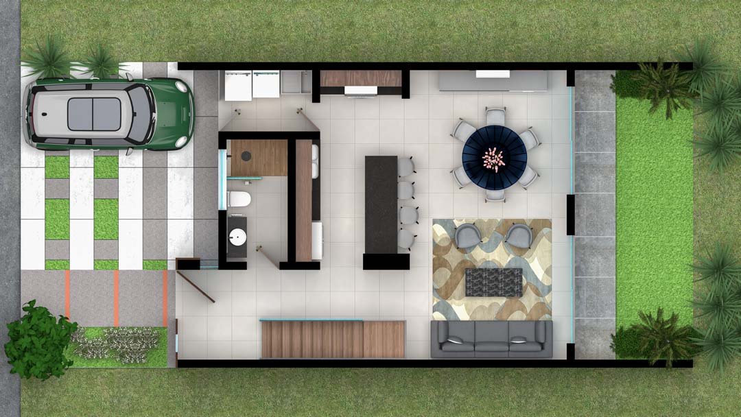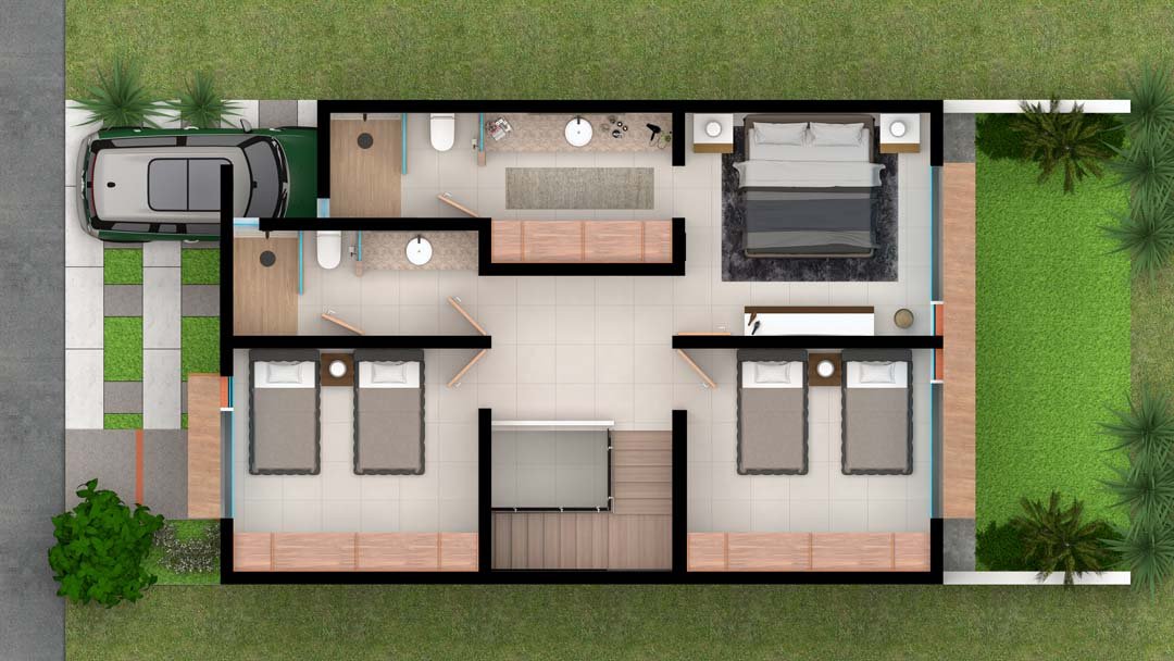 - Terraza, jardín y cochera para 2 autos