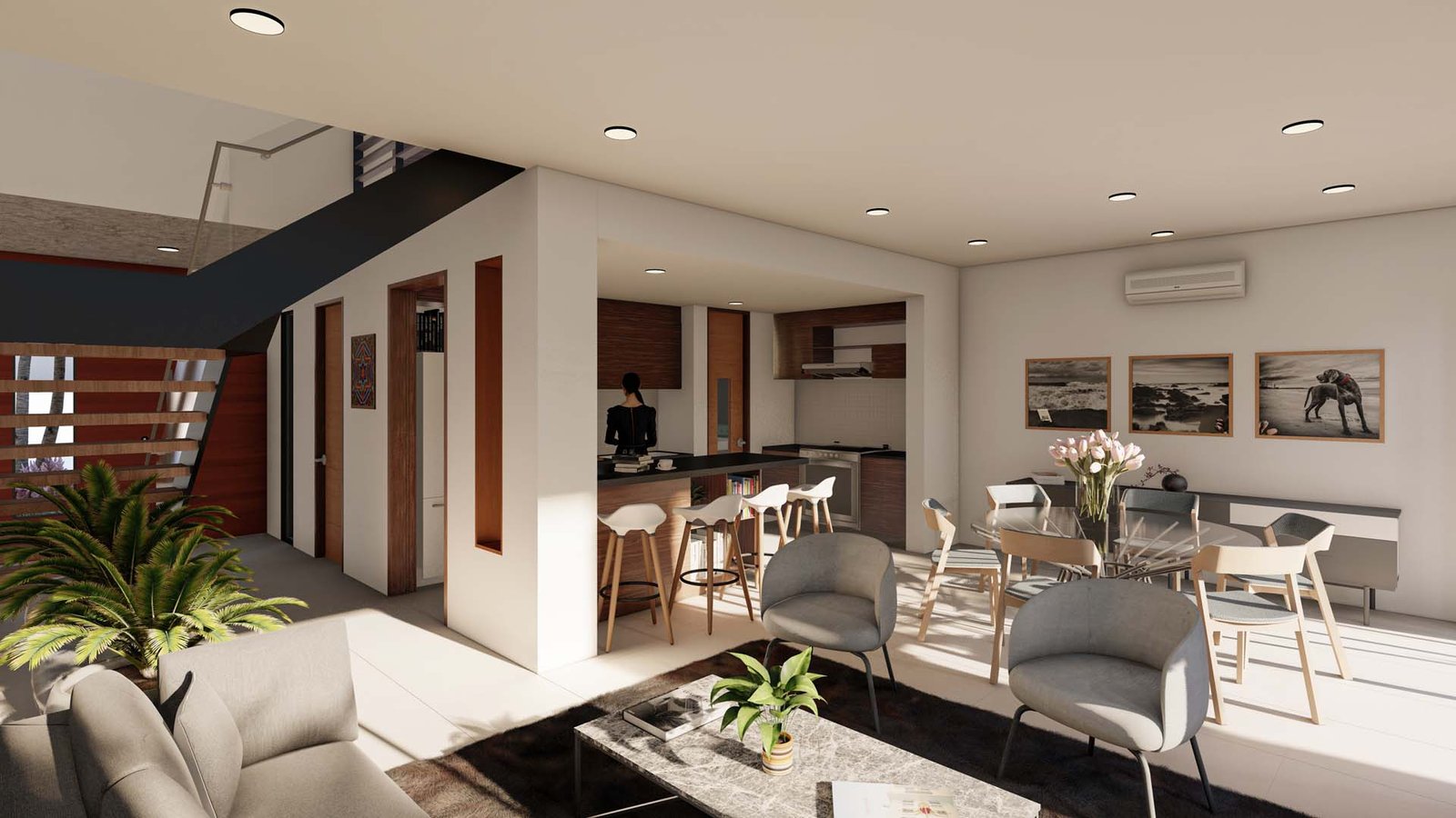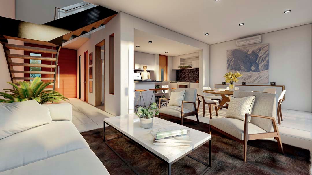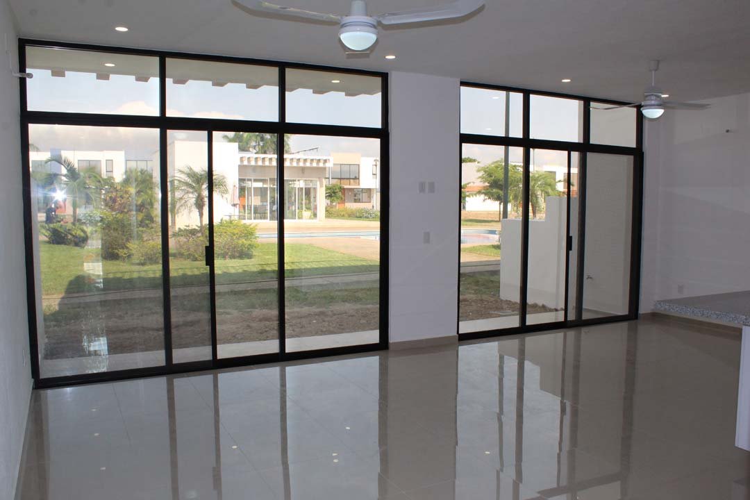 - Sala y comedor con vista a la terraza-alberca